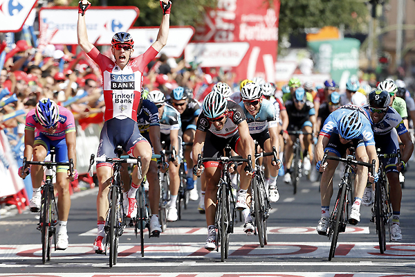In una tappa che non presentava particolari difficolta' e quindi adatto ad un' arrivo in volata, il tedesco della Omega Pharma Quick step, Toni Martin tenta un impresa che se riuscita l' avrebbe consegnato nella storia di questa corsa. Scatta dopo poche centinaio di metri e, specialista della cronometro com' e', disputa una vera e propria crono lunga 175 km. Avrebbe sicuramente meritato la vittoria, purtroppo la salitella finale gli e' fatale e Morkov lo supera a venti metri dal traguardo. Il vantaggio massimo nella fuga e' di 6 minuti, e all' inizio nessuno crede che Toni faccia sul serio. A 40 km dal traguardo il vantaggio e' di 3 minuti, ma col passare dei chilometri il vantaggio pur scendendo rimane ancora a buoni livelli. A venti chilometri dalla fine il vantaggio scende per la prima volta sotto il minuto. Tutti pensano che il tentativo del Tedesco sia destinato a terminare presto ed invece Martin ha ancora la forza di riavviare l' azione alzandosi sui pedali, e complice alcune discese e rotonde condotte da manuale resiste con una manciata di secondi di vantaggio. Il capolavoro lo compie negli ultimi dieci chilometri in cui riesce a tenere la stessa andatura del gruppo mantenendo una decina di secondi di vantaggio. Lo striscione dell' ultimo chilometro lo vede ancora in testa con 8 secondi di vantaggio, prima dell' incredibile atroce beffa finale. Per gli uomini di classifica, giornata tranquilla con Vincenzo Nibali che mantiene la maglia Rossa. Domani settima tappa, ancora abbastanza pianeggiante di 206 chilometri da Almendralejo a Mairena del Aljarafe